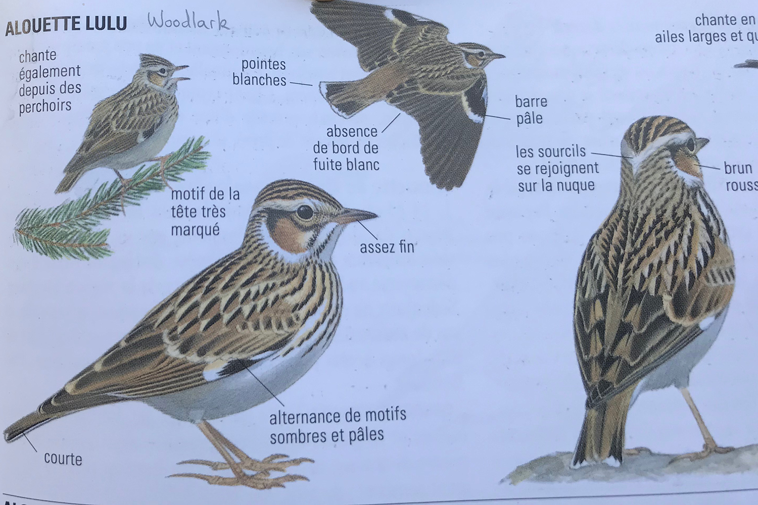 Le chant terminé par des grincements du Serin cini fait l’objet de commentaires tandis que, posée sur un piquet dans les vignes, une jeune Alouette lulu se laisse observer par toute la troupe.