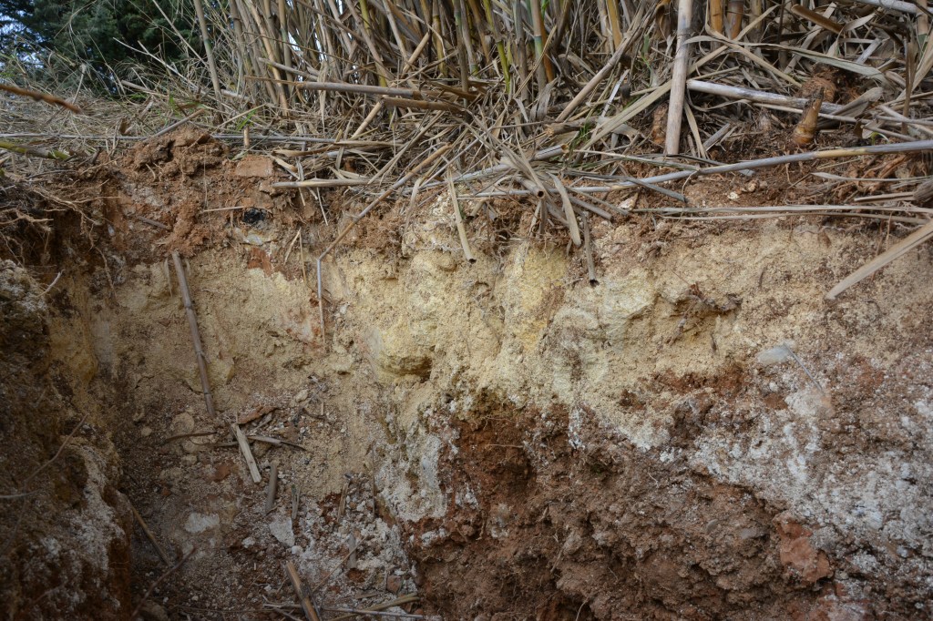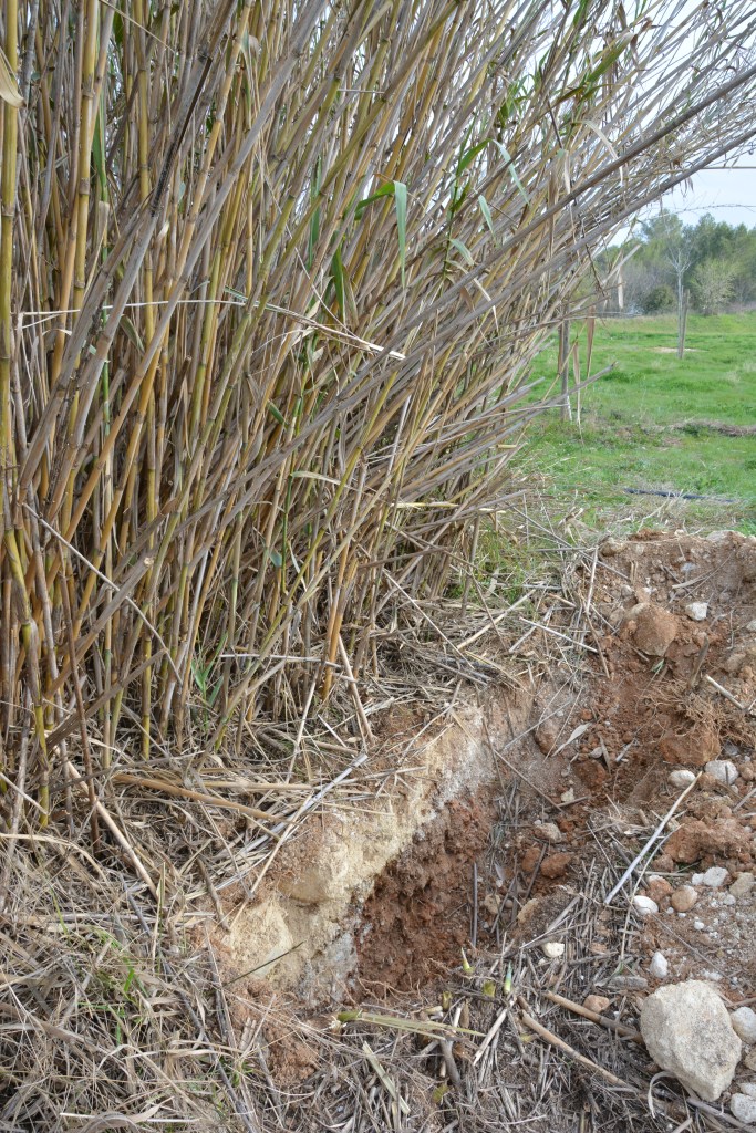 Nous passons à la troisième fosse, à proximité des cannes. Nous observons un sol inversé : d’abord la roche puis la terre. Des cannes progressent en surface avec des rhizomes d’où une colonisation superficielle car la stratification du sol est bloquante.