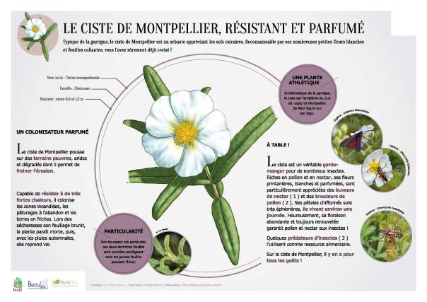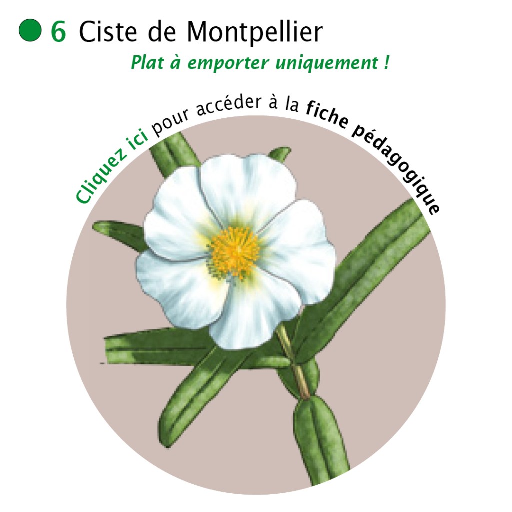 Devant l’entrée du parc un panneau sur le ciste de Montpellier a été installé récemment. Le feuillage vert foncé roussit avec la chaleur et peut servir d’indicateur aux pompiers sur les risques d’incendie. Ses fleurs sont blanches et il est absent de notre garrigue, à la différence du ciste blanc ou cotonneux, dont les fleurs sont roses.