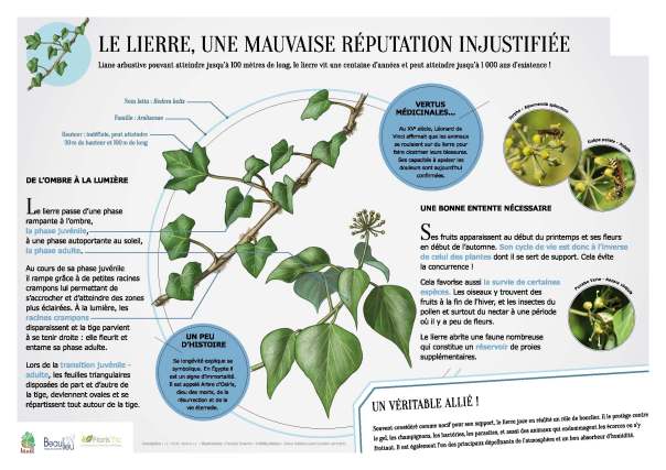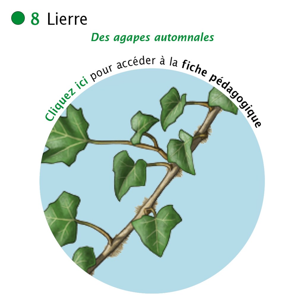 Reprenant notre promenade, nous passons devant le panneau du fenouil puis en tournant à droite nous découvrons sur une petite butte le panneau du lierre. Petite pause pour écouter le commentaire d’Yves concernant cette plante qui a souvent une mauvaise réputation. Elle colonise des surfaces importantes et se reproduit rapidement une fois à la pleine lumière. Le lierre n’abîme pas l’arbre et met en place un ombrage au tronc.