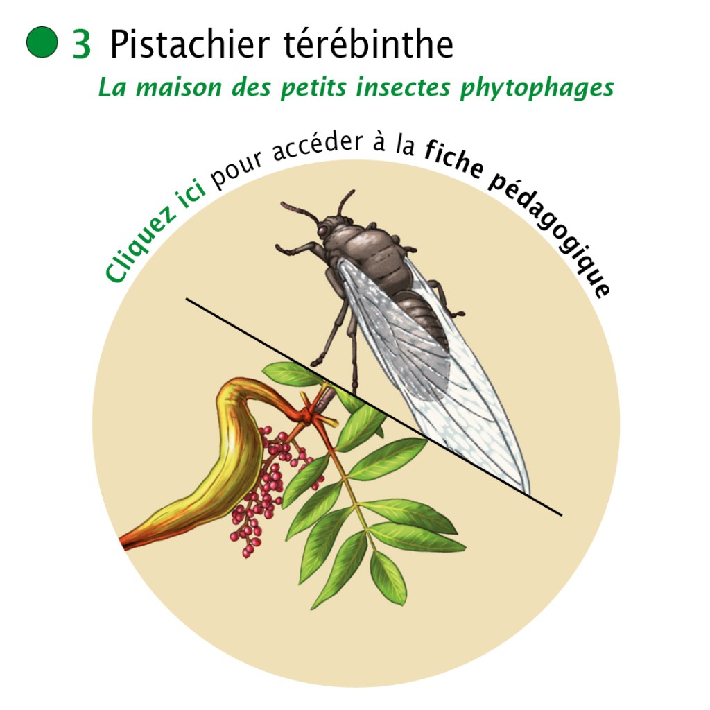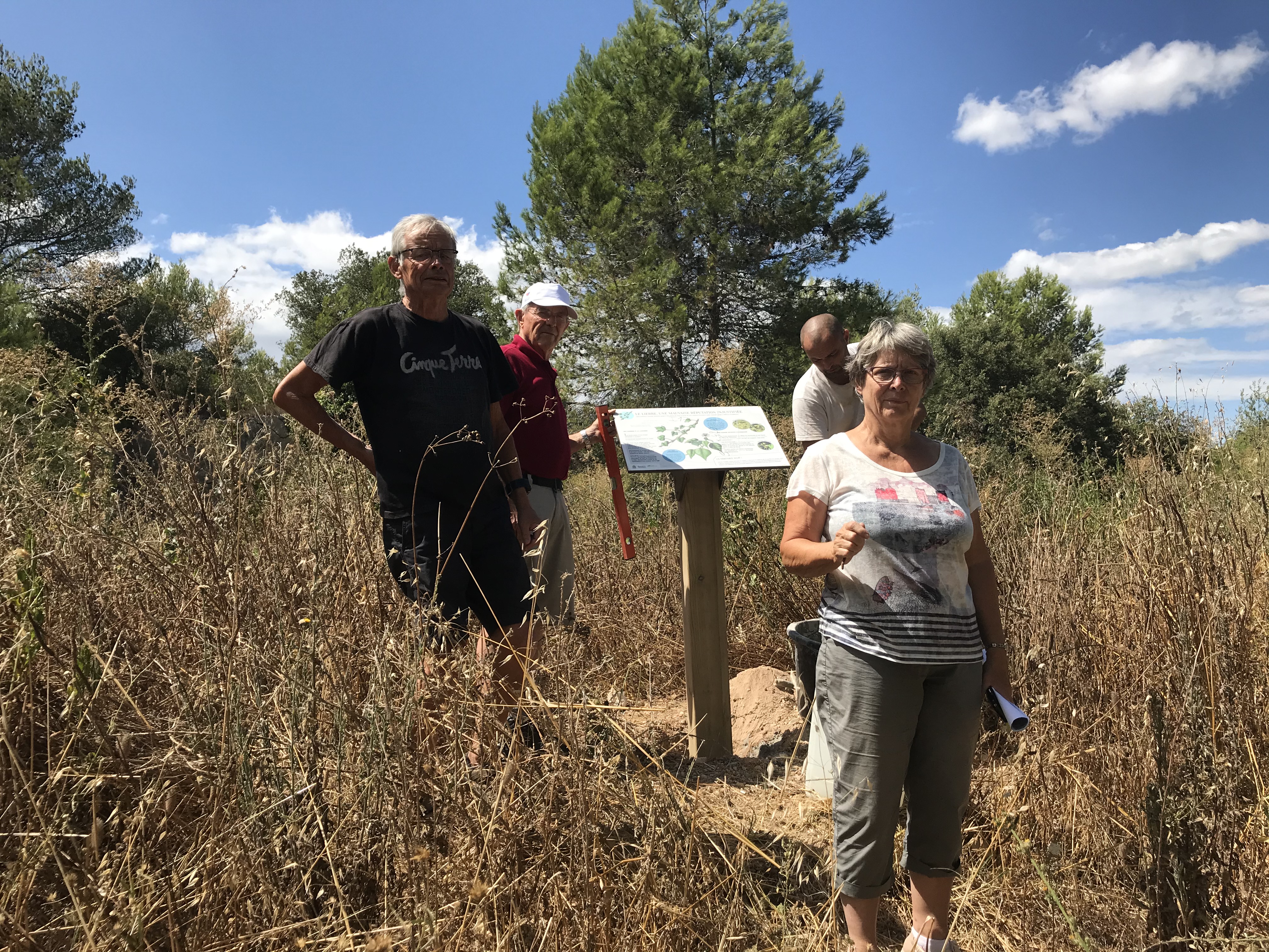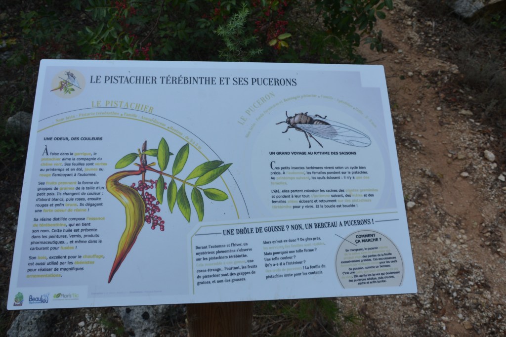 Petite pause devant le deuxième panneau consacré au pistachier térébinthe qui pousse à l’état naturel dans la garrigue, à la différence du pistachier lentisque –le restincle en occitan qui a donné son nom à la commune de Restinclières – le lieu où on plante le restincle- dont on ne retrouve plus la trace aujourd’hui sur nos deux communes. Il fut dans le passé utilisé pour en extraire le tannin destiné au traitement du cuir.