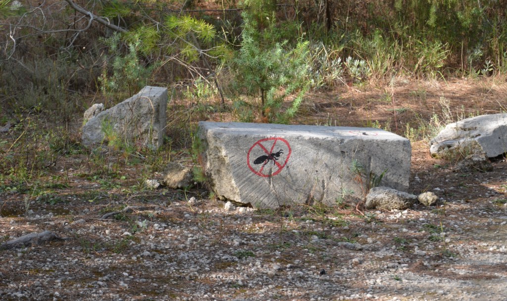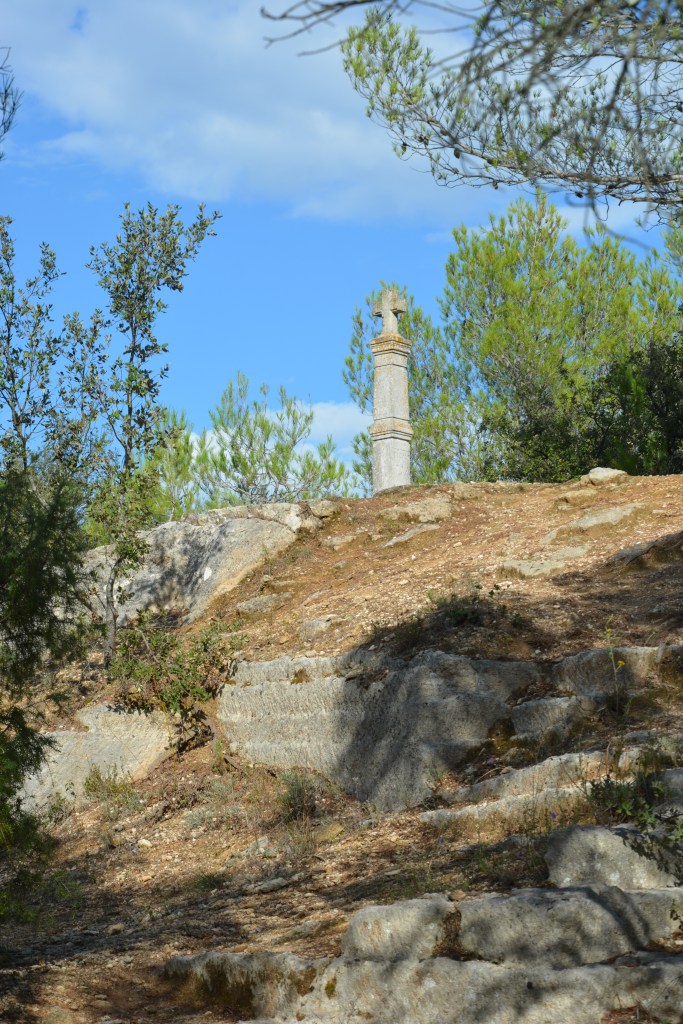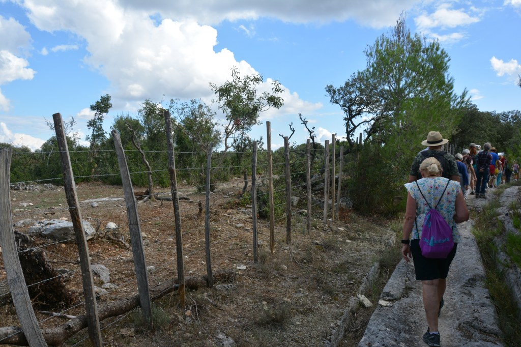 Nous arrivons à proximité des plantes accrocheuses comme la salsepareille de faible hauteur -3 à 4 mètres- qui forme de grandes draperies dans les arbres qu’elle enserre. Idem pour la clématite. On passe à côté du théâtre des carrières. Un arbre est tombé la nuit dernière. De cet endroit on peut accéder à un promontoire sur lequel a été installée la croix des carrières et d’où l’on pouvait, jusqu’à il y a une trentaine d’années, admirer tout le village. La garrigue était alors exploitée pour sa pierre, le bois pour les charbonnières et elle servait aussi de pâture aux moutons. Yves nous invite à distinguer le paysage remanié par l’homme avec des points hauts suite à l’exploitation de la pierre, du paysage naturel. Dès le Moyen-Age l’extraction concernait des petites zones destinées à la construction de maisons, bâtiments religieux et agricoles.