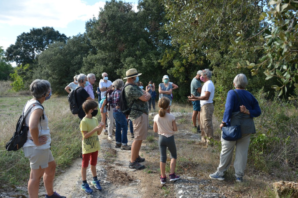 Un magnifique chêne vert clôturera cette balade. Alors que tout était pelé –pâture et exploitation de la pierre-, ce chêne a pu se développer à son aise sans subir des coupes meurtrières et en retour il assurait un bel ombrage aux bergers et bergères ainsi qu’aux moutons de ce temps révolu. Cet arbre qui pousse habituellement en peuplement est très dominant et ne laisse pas beaucoup de place aux autres plantes. La yeuse est l’autre nom du chêne vert et l’euzière, le lieu où il est planté. A cette occasion Yves rappelle que la toponymie est souvent en relation avec la botanique. Ainsi en est-il du lieu-dit « Ginestet » dépendant de Beaulieu qui désignait un lieu planté de genêts servant à fabriquer de la toile de maison. Un participant à la promenade nous signale que la consultation des anciens cadastres informait sur l’utilisation des terres –ce qui n’est plus le cas aujourd’hui-.