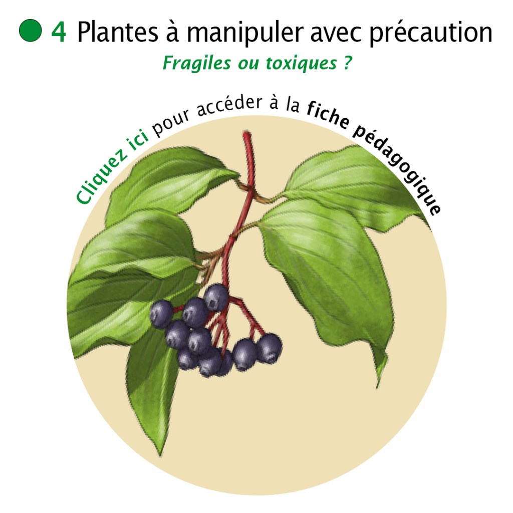 Le troisième panneau concerne des plantes dont il faut se méfier comme le cornouiller sanguin, un arbuste qui produit des baies noires susceptibles, si on les consomme, de provoquer des vomissements à la différence du cornouiller mâle aux baies rouges avec lesquelles on fait de la confiture. Yves nous met en garde aussi contre la toxicité du muguet et du laurier rose.