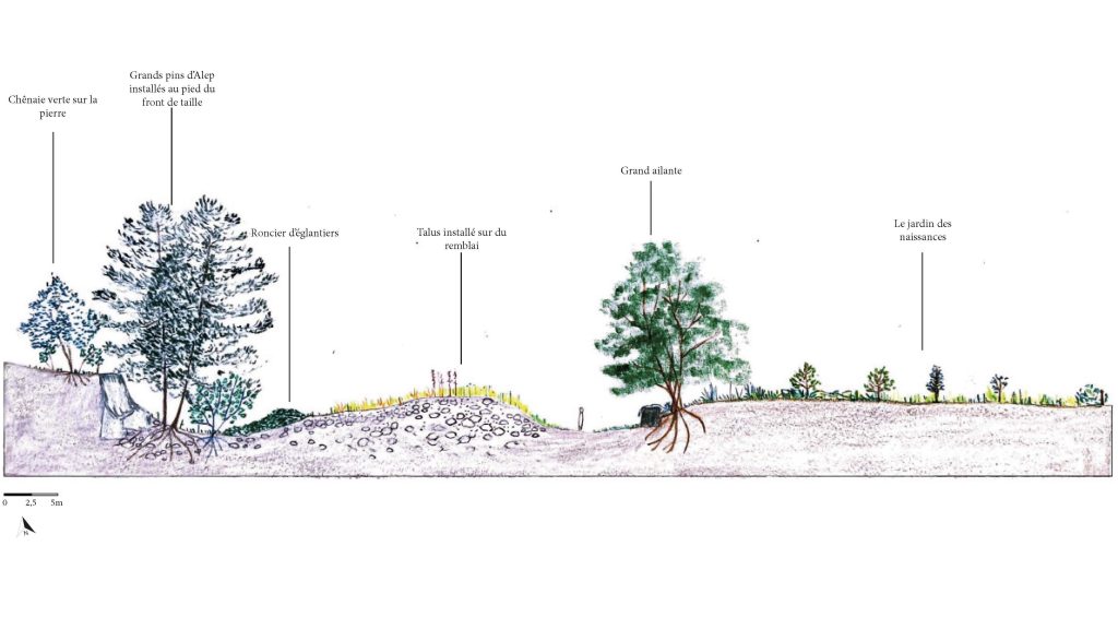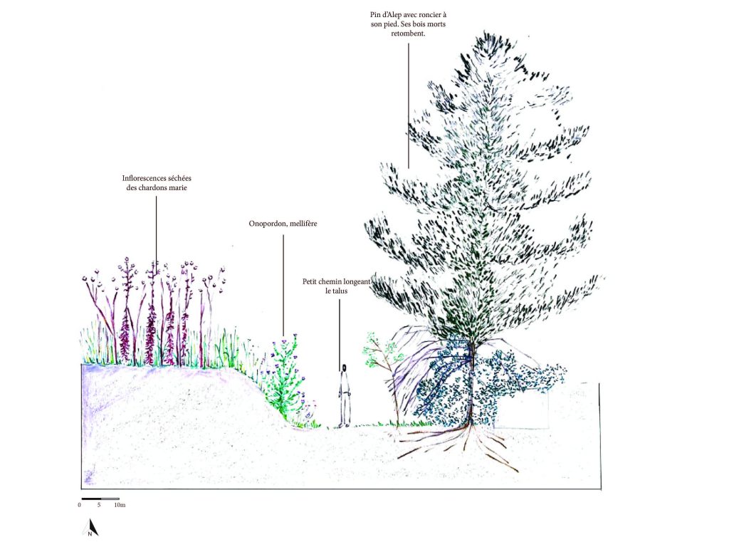 Alice et Delphine ont fait une étude de la nature, consigné les indicateurs des différents types de sol avec un relevé de la végétation. Elles ont réfléchis à l’aménagement en tenant compte du point d’accès haut, travaillé avec des calques, fait des coupes pour les différents étages de végétation.