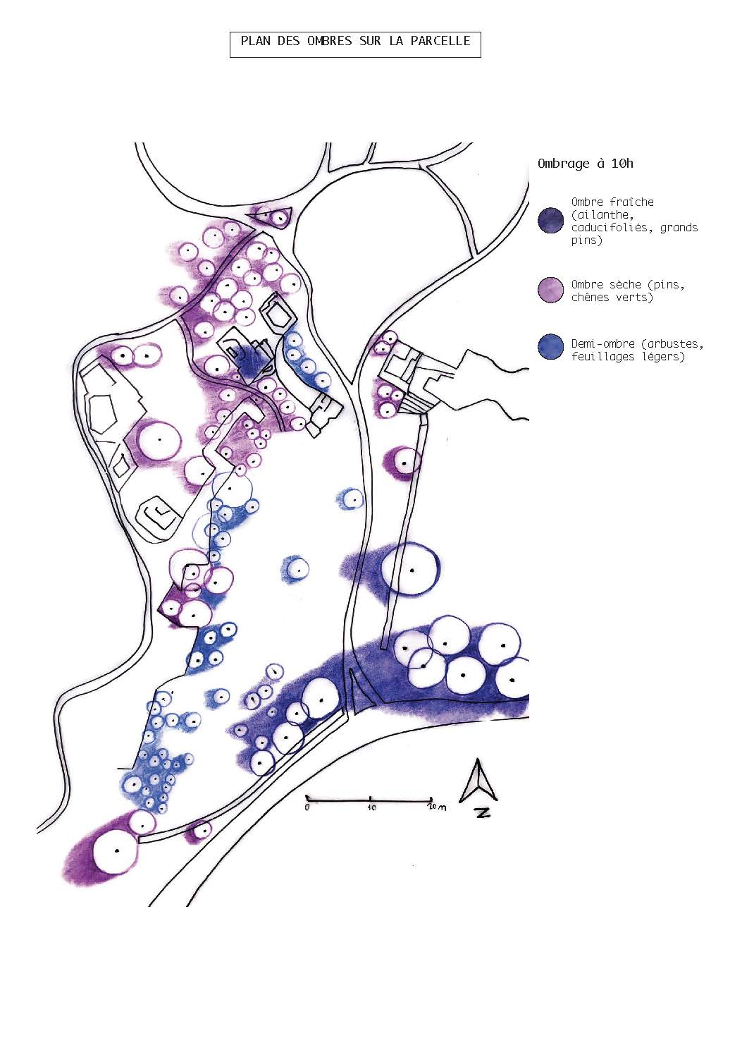 Alice et Delphine ont fait une étude de la nature, consigné les indicateurs des différents types de sol avec un relevé de la végétation. Elles ont réfléchis à l’aménagement en tenant compte du point d’accès haut, travaillé avec des calques, fait des coupes pour les différents étages de végétation.