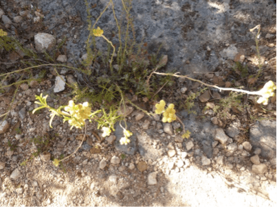 - et résister aux prédateurs grâce à de grosses molécules odorantes. Il en est ainsi des plantes condimentaires comme la sarriette. Les petites feuilles ont une odeur qui dissuade certains petits prédateurs. Les grosses molécules font que la déperdition de l’eau est moindre. Ces plantes arrivent à se développer dans des fissures ou des petites dépressions avec peu de sol. On a du thym avec un gros feutrage de racines. Le matin le sol est mouillé comme dans le désert. Le système racinaire est important, de petite dimension et peu profond et ainsi la plante peut absorber cette eau superficielle. L’été certaines plantes se dessèchent, c’est facile à observer sur les mousses mais le Ciste de Montpellier fait de même, ses feuilles roussissent et avec les pluies d’automne elles reprennent leur couleur verte.
